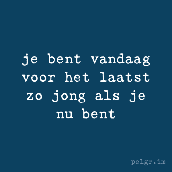 Laat dat eens goed tot je doordringen. Je bent jonger dan dit geweest, ja, maar vandaag, nu, op dit moment, ben je voor het laatst zo jong als je nu bent. Volgende week ben je weer een weekje ouder.